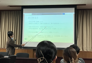 説明会の後半では、在学生3名が登壇し、OSIPPでの学びや学生生活について体験談を共有した。それぞれの発表では、授業を通じて多様なバックグラウンドを持つ仲間と意見を交わす機会が多いことや、学生同士の交流が活発であることなど、学内コミュニティの魅力が語られた。また、授業外でも留学生や社会人学生との交流が盛んであり、異なる専門分野や文化的背景から刺激を受けながら視野を広げられる環境が整っている点が強調された。さらに、社会人学生もzoomで参加し、オンライン授業や土曜日、第6限の授業などを活用し、仕事と学業を両立させながら、長期履修制度を通じて自分のペースで学びを深めていると語った。