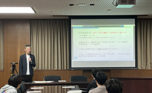 説明会の冒頭では、教務委員長の河村倫哉教授が登壇し、博士前期課程の冬季入試情報や指導体制、学生支援制度などについて解説した。特に、社会人学生向けの長期履修制度や、海外提携大学とのダブルディグリープログラム、他研究科・他大学との単位互換制度など、学びの多様性を支える制度が紹介された。