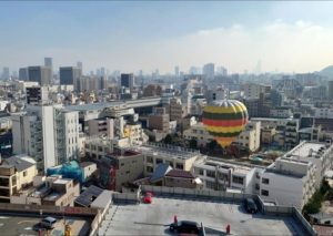 赤井先生や故・山内先生の紹介でNPO関係者と交流する中で、地域活動の重要性を実感しました。そこで、子供が通う西九条小学校のPTA役員を務める中で、子どもたちの思い出に残る活動として、小学校の校庭で気球を飛ばすイベントを開催しました。これが好評を博し、多方面から声がかかるようになりました。(写真:実際に飛ばした気球)