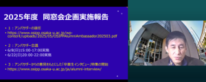 2025年11月30日、OSIPPオンライン大同窓会2025が開催された。この会は赤井伸郎教授をはじめとする同窓会実行委員会の尽力により企画され、OSIPP修了生のネットワークの強化・および現役生や教職員との交流を目的としている。当日は修了生に加えて、現役生や現職・退職教職員が参加し、画面越しながらもにぎやかな雰囲気となった。