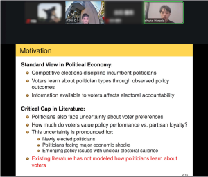 同じく博士前期課程2年次である原田嵩弘さんは、“Learning from Electoral Competition: How Politicians Adapt to Voter Preferences”と題した論文を発表した。報告では、選挙が政治家の行動を規律づけるメカニズムを、政治家が選挙を通じて有権者の選好を学習するという視点から説明した。これまでの研究が、有権者が政治家のタイプを見極める過程に焦点を当ててきたのに対し、政治家自身もまた、有権者が政策の成果を重視するのか、党派的立場を重視するのかといった点について、不確実性を抱えている点を強調した。その上で、政治家の私的利益を追求する行動は、競争的な選挙に直面することによって直接的に抑制するだけでなく、選挙を通じた有権者の選好に関する学習によっても抑えられることを示し、選挙競争が政治家の行動を規律づける2つの経路を示した。