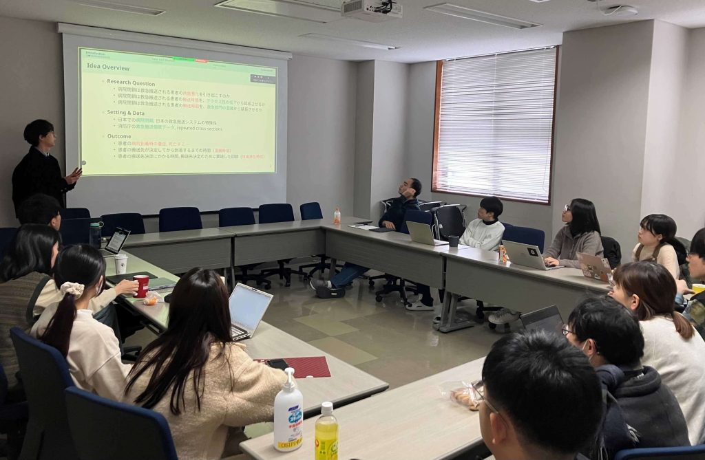 秋冬学期のワークショップでは、博士前期課程の学生と博士後期課程の学生それぞれ7名、合計14回の発表が行われました。発表内容は、研究の途中経過の発表、研究アイデアの発表、因果推論手法に関する論文の解説など多様であり、議論することを重視しました。結果的に、修士論文提出前に幅広くコメントをもらいたい博士前期課程2年の学生、発表機会を設けることで研究を進めたい学生、学会発表に向けて質疑応答の練習をしたい学生、修士論文のアイデアを構想中の博士前期課程1年の学生など、さまざまな立場からのニーズがあることが分かり、それぞれの発表者の目的に合わせてワークショップが活用されました。発表内容の関心に合わせて、多様な年次の学生が毎回15名ほど集まり、45分の時間の中で発表と議論を行いました。昼食を取りながら参加できるリラックスした環境でありつつ、リフレッシュルームで友人同士が話す場よりはフォーマルな、ほどよい緊張感のある雰囲気です。