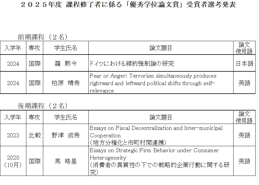 当該年度に提出されたすべての課程博士論文および修士論文を対象に、それぞれ優秀学位論文が選出されました。優秀学位論文の選考はOSIPP優秀論文選考委員会が行い、教授会が選考委員会からの推薦を受けて、下記のとおり決定しました。優秀学位論文賞の受賞者には、学位記授与式にて賞状が授与されます。