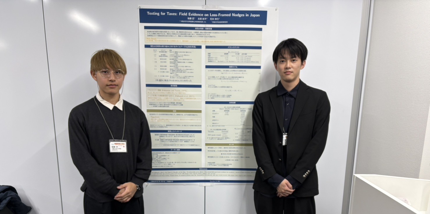 OSIPP在学生紹介 OSIPP博士前期課程1年次の後藤 匠さんと古屋 航平さんが、2025年12月14日に早稲田大学で開催された行動経済学会第19回大会においてポスター報告を行いました。 (写真:ポスター報告時の後藤さ …