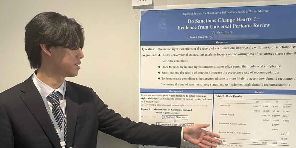 OSIPP在学生紹介 OSIPP博士後期課程1年次の上村成さんが、2026年1月6日に早稲田大学で開催された 計量・数理政治学会 (JSQPS) 2026年冬季集会においてポスター報告を行いました。 (写真:ポスター報告 …